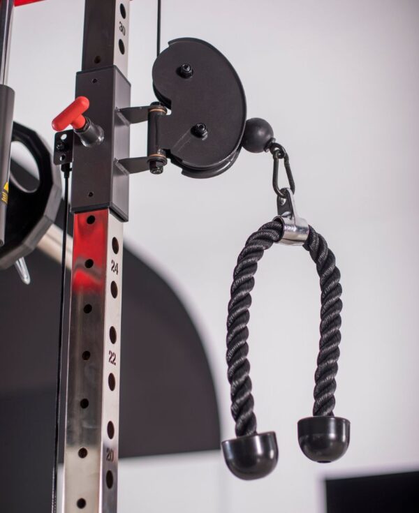 Semi-Profesional. Incluye doble polea regulable con dos torres de placas independientes y barra guiada para ejercicios de maquina Smith (discos no incluidos), Conversion en Half Rack para ejercicios con barra libre. (no incluida)  Multiples accesorios